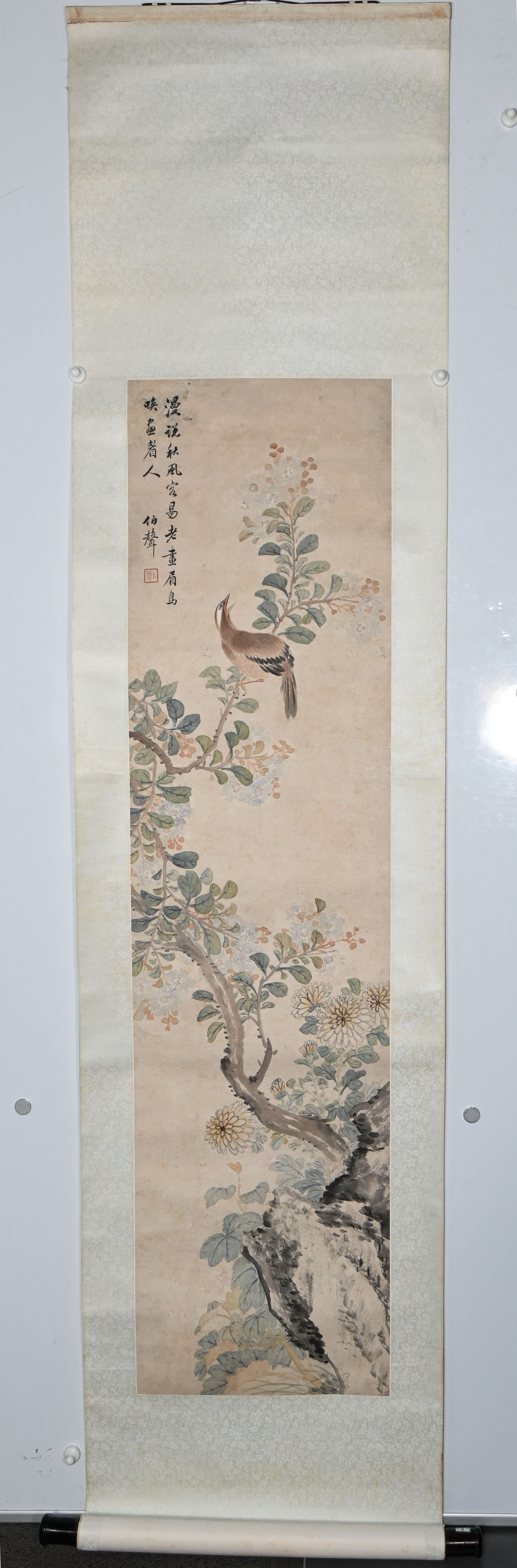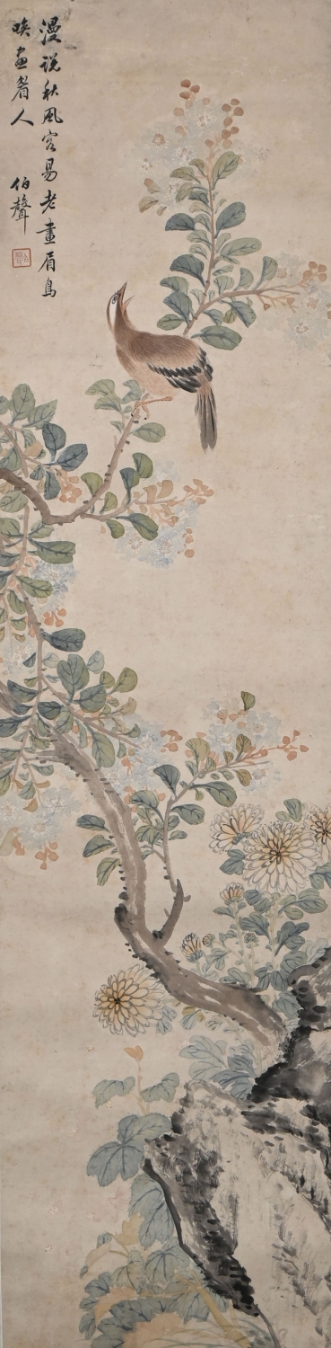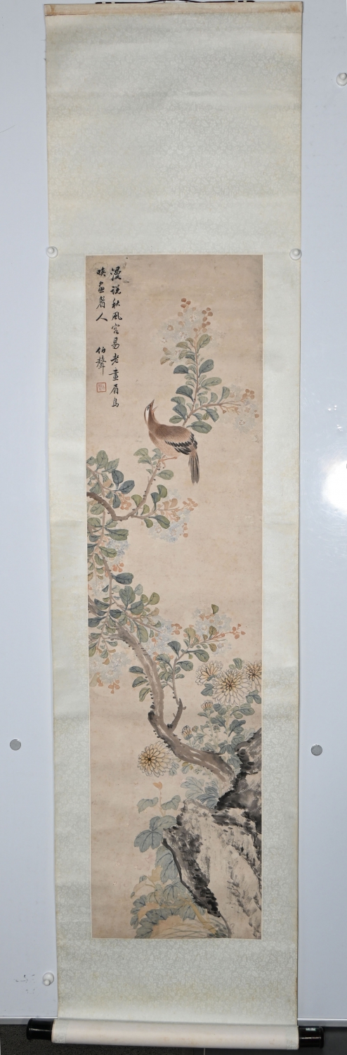 靳伯声(1901—1967),河北香河县人。1915年到天津一家南纸店学徒。1923年,在天津自己跑业务,经营新字画和仿古画。1926年来北京在粮食店街上的北方旅馆租长房,做起新旧字画生意了,同当代的书画家交往,和琉璃厂论古斋韵古斋古玩铺,清秘阁荣宝斋南纸店做买卖。1944年,他将在琉璃厂开了34年的论文斋倒到自己的手里,开起古玩铺,鉴定经营古代名人字画,入了古玩行。1956年加入公私合营,分配在宝古斋当业务员,1967年去世。