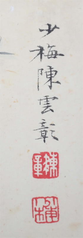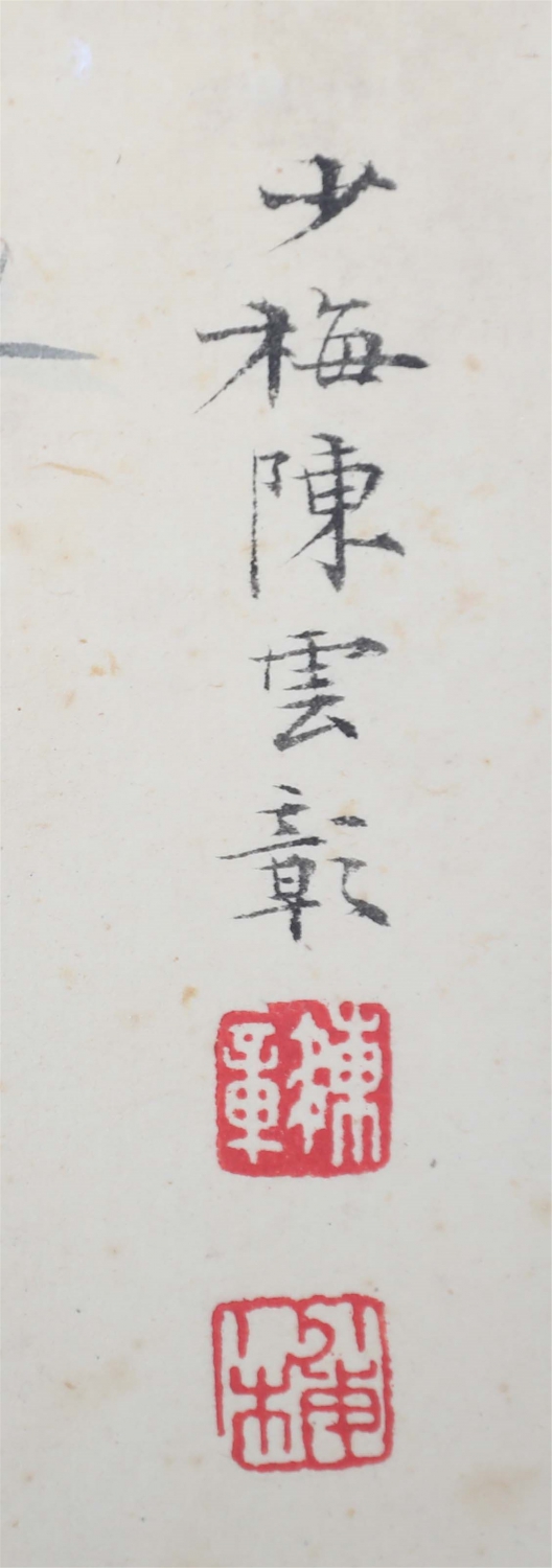 陈少梅(1909年4月—1954年9月),男,汉族,名云彰,又名云鹑,号升湖,字少梅,以字行,生于湖南衡山的一个书香之家,现代画家。自幼随父学习书画诗文,深受中国传统文化的熏陶。15岁加入金北楼、陈师曾等发起组织的“中国画学研究会”,17岁成为名噪一时的“湖社画会”之骨干,22岁主持“湖社天津分会”,成为津门画坛领袖。1930年他的作品获“比利时建国百年国际博览会”美术银奖,以后开始在画坛崭露头角,成为京津一带颇有影响的画家。新中国成立后,他任中国美术家协会天津分会主席、天津美术学校校长。