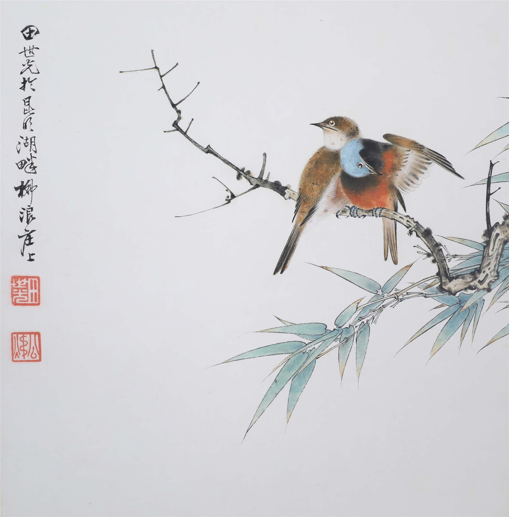 田世光(1916年10月—1999年7月)号公炜,祖籍山东乐陵,世居北京西海淀六郎庄。师承张大千、赵梦朱、吴镜汀、于非闇、齐白石诸先生。早年拜张大千门下,为大风堂弟子之一 。早年求学于京华美术学院,专攻国画花鸟,解放前在北平国立艺专任教,曾任中央美院教授。他长期从事花鸟、山水画创作,继承了宋元派双勾重彩工笔花鸟画的优良传统技法,并赋之予新的时代精神,为我国现代工笔花鸟画名家。田世光先生是中国美术家协会会员,北京工笔重彩画副会长,中国画研究院第一届院务委员。