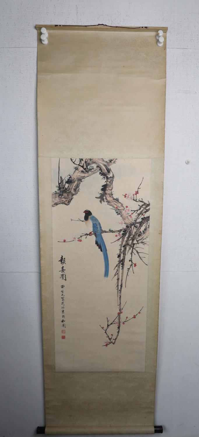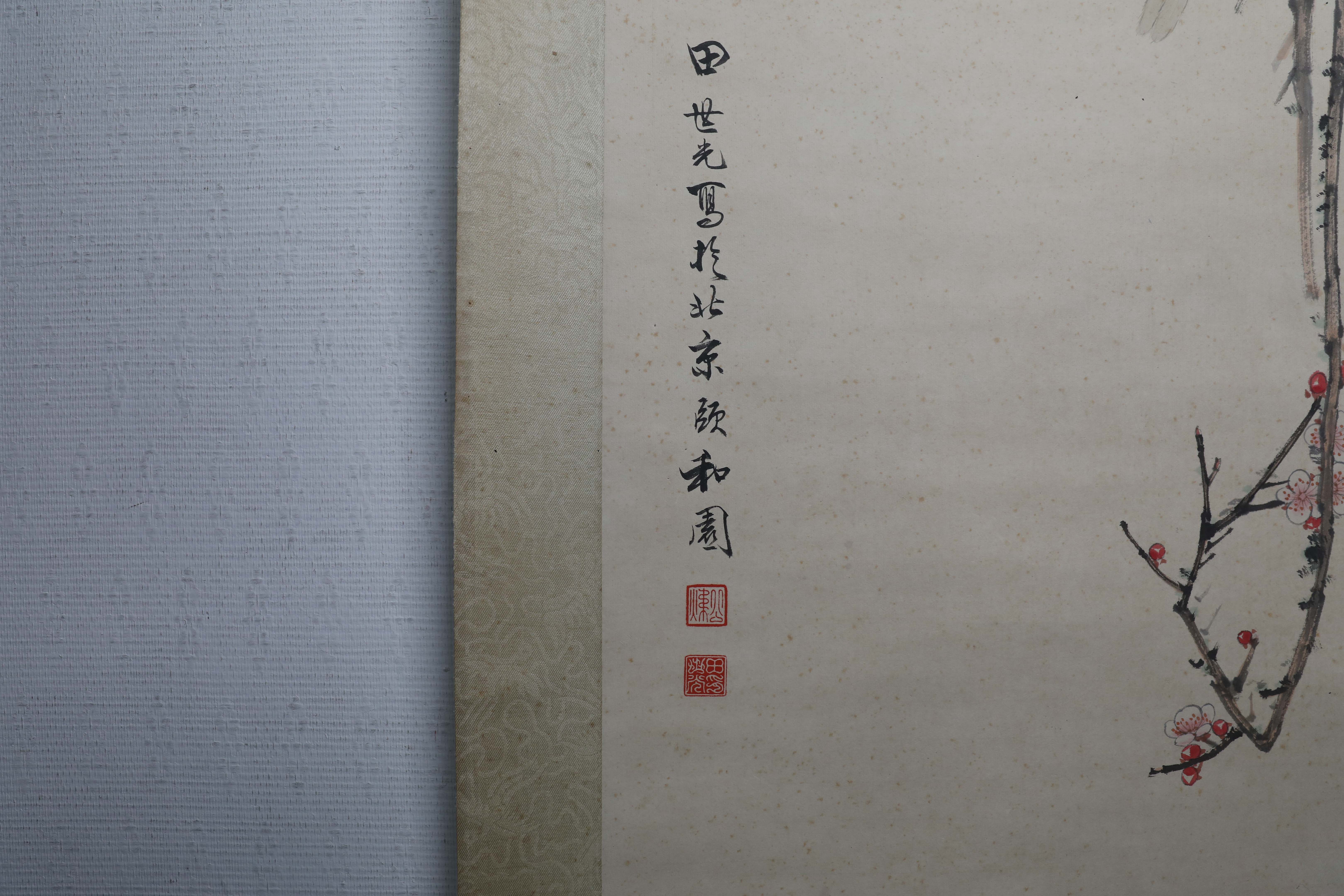 田世光(1916年10月—1999年7月)号公炜,祖籍山东乐陵,世居北京西海淀六郎庄。师承张大千、赵梦朱、吴镜汀、于非闇、齐白石诸先生。早年拜张大千门下,为大风堂弟子之一 。早年求学于京华美术学院,专攻国画花鸟,解放前在北平国立艺专任教,曾任中央美院教授。他长期从事花鸟、山水画创作,继承了宋元派双勾重彩工笔花鸟画的优良传统技法,并赋之予新的时代精神,为我国现代工笔花鸟画名家。田世光先生是中国美术家协会会员,北京工笔重彩画副会长,中国画研究院第一届院务委员。